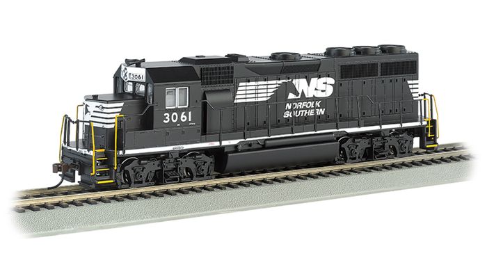 EMD GP40 - EMD GP40 - NORFOLK SOUTHERN #3061 - SOUND-VALUE EQUIPPED - HO SCALE. The GP40 was considered the top of EMD’S four-axle line when first introduced in the late 1960s. It visually differed from earlier GP models, featuring three radiator fans on its long hood, but was otherwise similar in style to the GP38, which entered production around the same time. The locomotive was popular for its ease of maintenance and standardized features and remained in production until succeeded by the GP40-2 in the early 1970s. Today, many remain in service hauling local freights and performing yard duties. The Bachmann HO Scale GP40 features realistic, prototypical detail, fine-scale handrails, and comes with Soundtraxx Econami™ Sound Value On Board.