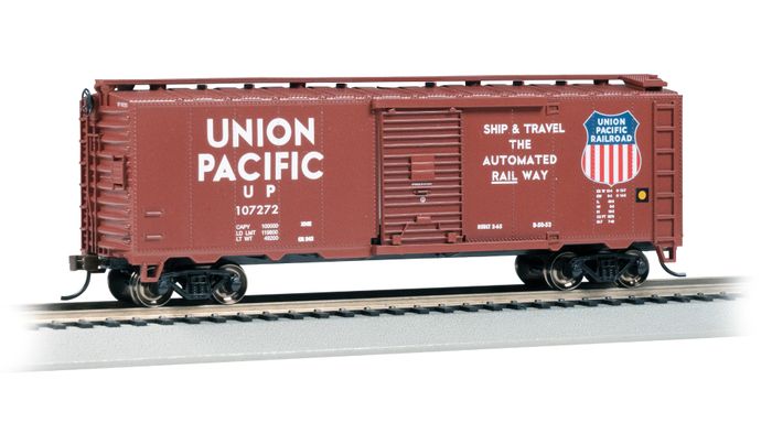 40' Boxcar - Union Pacific® #107272 - HO Scale. Boxcars are the workhorses of the railroad, economically moving dry goods and bulk freight from coast to coast, and from factories to distributors everywhere in between. From the early to mid-20th century, the 40' Boxcar was the standard size offered by most major railcar manufacturers. Useful for hauling both long-distance bulk shipments and smaller mixed loads for local deliveries, the type remains one of the most iconic freight cars in American history.