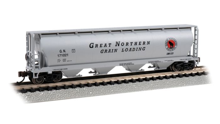 N Scale 4-Bay Cylindrical Grain Hopper - Great Northern #171021. First developed in the late 1960s, the Cylindrical Hopper was both unique in appearance and enjoyed better structural integrity than the available alternatives of the time. While the type saw modest success in the United States, it was the amount purchased by Canadian interests that led to its widespread use. Due to aging rolling stock with limited capacity, Canadian wheat farmers were experiencing supply-chain issues in getting their goods to market. To help rectify this, the Canadian Government purchased a whopping 13,000 cars between 1970 and 1990 for shared use between Canadian National and Canadian Pacific. While more were purchased by individual railroads, it was these government-sponsored cars that turned heads, thanks to their vibrant red, orange, and blue paint schemes, proudly advertising Canadian wheat and the provinces it was grown in. Today, many of these cars remain in service, and thanks to the sheer number produced, they can be spotted in both unit trains and on mixed freights across North America.