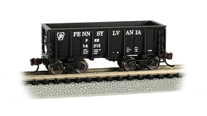 N Scale Ore Car - Pennsylvania Railroad #14515 - Black. Ore cars were specialized rail cars designed specifically for carrying iron ore from the iron ranges to manufacturing centers typically found in the Midwest, where it would be used in the production of iron and steel products.