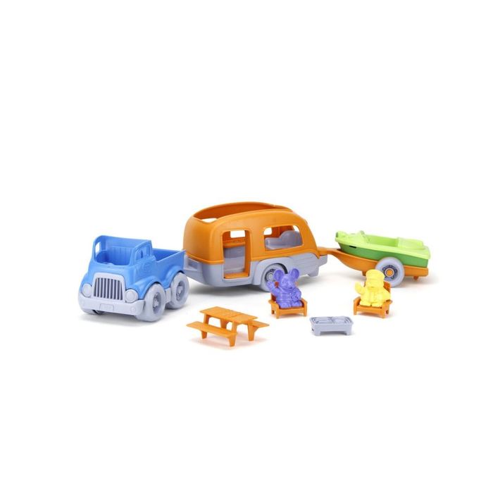 Time to hit the road! The Green Toys™ RV Camper Set is loaded up and ready for an adventure! This colorful, 3-in-1 vehicle playset has something for everyone, featuring a pick-up truck, spacious camper, and sport boat with its very own trailer. Play with them individually, or link them all together for two feet of fun! And don’t forget the accessories – two characters, two chairs, a picnic table, and a camping stove round out this 10 piece set with endless narrative play possibilities. Great for indoor and outdoor play, the super-safe design has no metal axels or exterior paints or coatings.