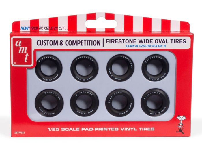 BY POPULAR REQUEST: AMT is proud to present its 1/25 scale Firestone “Wide Oval” muscle car tires in a super-handy Custom & Competition parts pack! They’re perfect for the intermediate modeler who wants to add some excitement and flash to their muscle car model builds.