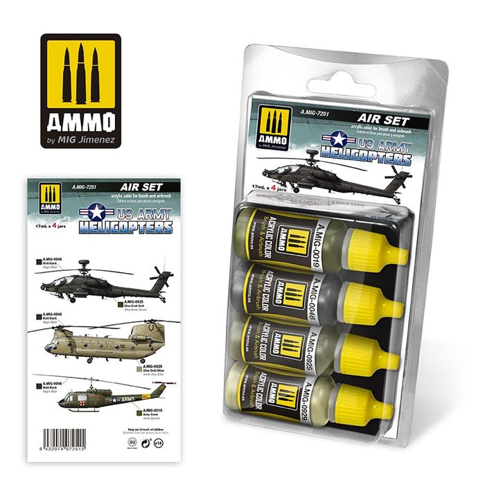 Includes the necessary colours used to paint the mythical AH-64 Apache, UH-1 Huey, CH-47 Chinook, and UH-60 Blackhawk, among others. The colours are accurate and slightly lightened to compensate for the scale effect of any model. This paint features a formula optimised for maximum performance with both brush and airbrush. Four colours in 17ml containers. Shake well before each use. Each bottle includes a steel stirrer for easy mixing of the paint. Water soluble, odourless, and non-toxic. For the best results, use A.MIG-2000 Acrylic Thinner for proper thinning. Dries completely in 24h.