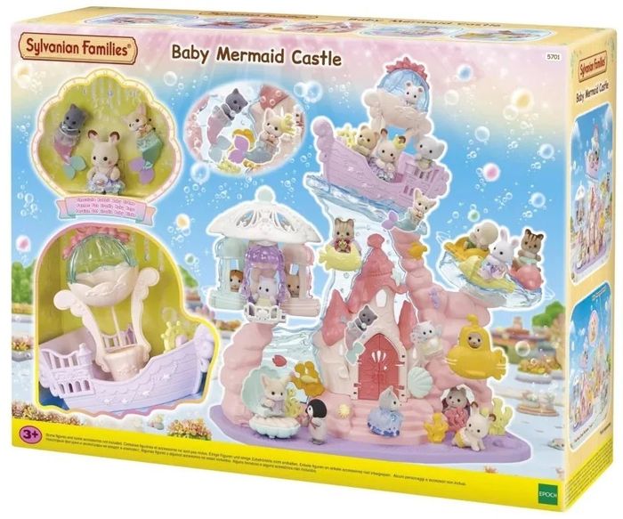 Set featuring an undersea-themed amusement park, along with three baby figures. Includes a beautiful Mermaid Castle, "Aqua-Go-Round" Ride, Jellyfish Swings and plenty more for baby and cradle baby figures to ride in! The figures are all wearing special mermaid-themed outfits. Use the "Mermaid swim holder" to make it look like the babies are swimming! The Dream Ship can be removed and played with on its own. Suitable for use as a display piece, with room for over 50 baby figures.