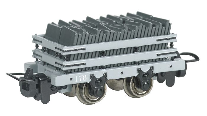 THOMAS & FRIENDS™ NARROW GAUGE SLATE WAGON with LOAD - Runs On N Gauge Track. Slate Trucks are the Skarloey Railway's most common type of truck, and can be seen as the narrow gauge counterparts to the Troublesome Trucks. Besides transporting slate, they have been known to transport broken branches, hay bales, cows, and sheep. Bachmann carefully reproduces your favorite Thomas & Friends™ characters. All rolling stock features highly detailed, realistic plastic body shells, all-metal wheels, and narrow gauge international-style hook-and-loop couplers. A narrow-gauge railway is one where the spacing between the rails is less than the standard (4 ft 8 1/2 in) spacing found on typical railroads. Historically, narrow-gauge railways are most often found in mining, logging, light industrial, and light passenger service.