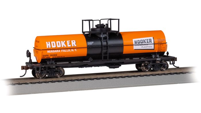 HO Scale Chemical Tank Car - Hooker Chemicals #15686. First appearing on American railroads in the late 1940s, Chemical Tank Cars provided a safe and efficient means for transporting industrial liquid loads. To protect the potentially volatile or corrosive chemicals they were intended to carry, the cars were built with more durable construction methods than previous tank cars and were among the first to feature a pressurized, welded body. Some of their primary spotting features were their specially-designed domes, featuring safety platforms to provide greater protection for both the contents of the cars and those handling them. The Bachmann HO Scale Chemical Tank Car incorporates new and existing tooling to represent two car styles found operating from the 1950s to the 1970s. With authentic paint schemes, E-Z Mate® couplers, and blackened, machined metal wheels, the Bachmann Chemical Tank Car is ready to enter service on your railroad’s freight roster.