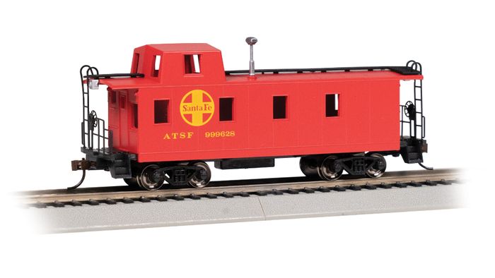 STREAMLINED CABOOSE WITH OFFSET CUPOLA - Santa Fe #999628 - HO Scale. The original design of this Streamlined (sometimes called Offset) Caboose was built by the Chicago, Burlington, and Quincy Railroad. The crew sat in elevated seats to inspect the train from the cupola while the train was moving. The caboose also provided the train crew with shelter at the rear of the train. The crew could exit the train for switching or to protect the rear of the train when stopped. Bachmann Streamlined Cabooses come in a variety of colors and road names.