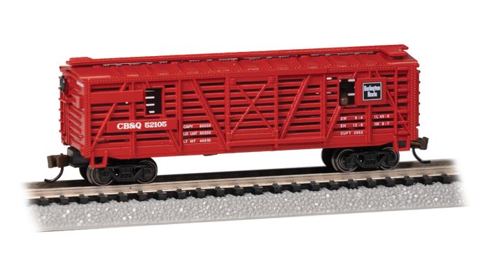 N Scale Animated Stock Car - CB&Q #52105 with Cattle. Enjoy the action as four animal heads peek back and forth through windows as the Bachmann Animated Stock Car moves across your layout! Stock Cars, sometimes referred to as cattle cars, are a type of rolling stock used to transport livestock. They were a common sight from the late 1800s right up until the mid-1950s when most were replaced by trucks. The Bachmann Animated Stock Car rekindles the heyday of these cars with a selection of attractive paint schemes and animated animal cargo, including cattle, horses, and reindeer!