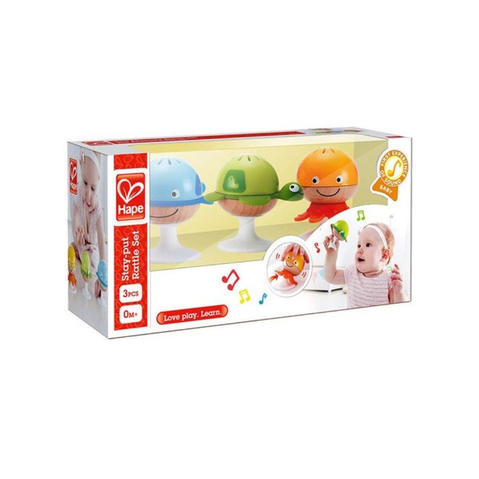 Babies will be enchanted by the Stay-put Rattle Set’s differing sounds, bright colours and aquatic animals. Moreover, with their handy suction cups, playtime is possible anywhere, anytime! Attach one of the Stay-put Rattle Set’s toys to a smooth surface using the rattles’ suction pad and enjoy musical play and experimentation wherever you are.