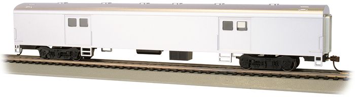 72' Smooth-Side Baggage Car - PAINTED, UNLETTERED - ALUMINUM - HO Scale. In the 1930’s lighter weight materials allowed for the development and production of a variety of coach, baggage, and observation cars as railroads ushered in the beginning of the streamline era. Materials like stainless steel, and aluminum, allowed for passenger cars to have smooth or fluted sides and smooth roof lines.