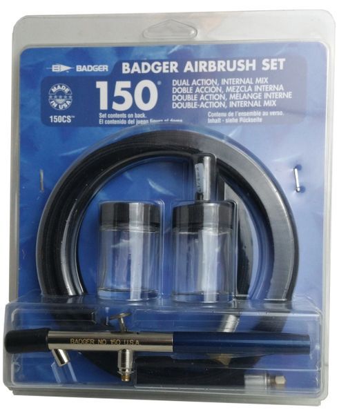 The versatility of the 150® allows for a broad range of applications,making it the “classic” airbrush in the Badger line.The 150®accepts a 3/4 oz. colour cup for small volume painting needs, or three largersized jars can be used for bigger jobs. Used by everyone from artists to taxidermists and auto customizers to furniture refinishers, this airbrush sprays properly reduced acrylics, acrylic enamel and lacquers, gouaches, fabric colours, water colours, inks, dyes, Air-Opaque™, Air-Tex®, MODELflex®, TotallyTattoo® and Totally Tan™ airbrush colours.