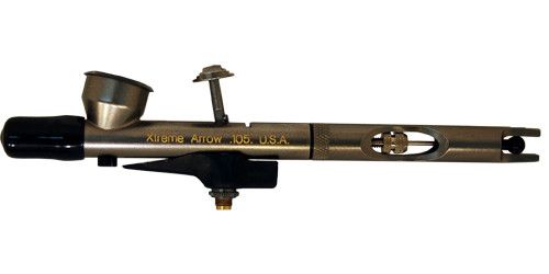 Xtreme Arrow 105 Super Detail Nozzle Airbrush w/ 2ml attached color cup featuring PAC dial, High Roller Trigger, Finger/Thumb rest, Accuracote finish in sturdy storage case