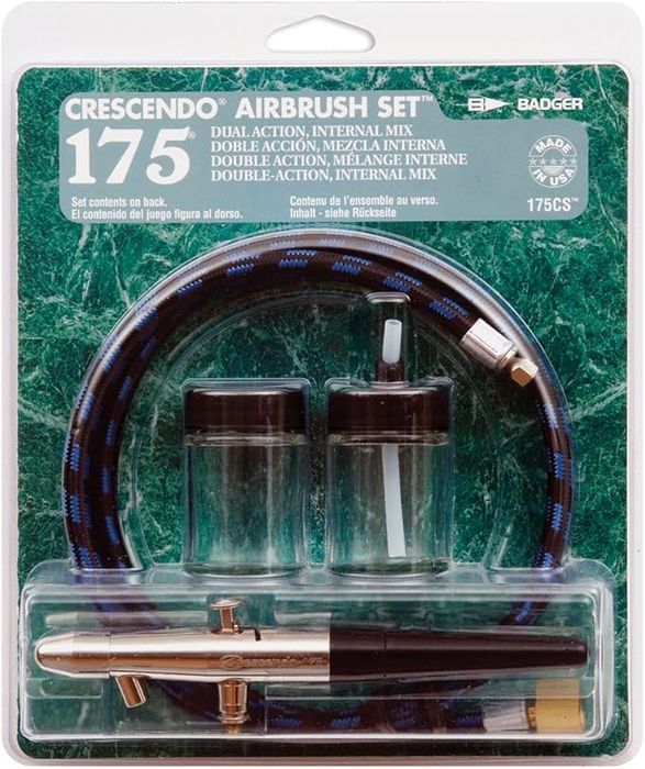 Crescendo 175 Bottom Feed Medium Nozzle Airbrush w/ 22ml jar and adapter, 22ml mixing jar, braided air hose in clamshell packaging