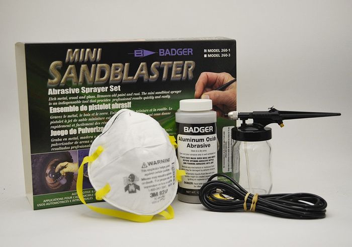 The Model 260-1 Set includes: a hobby abrasive gun with attached 4-Ounce (120 millimeter) jar, air hose with compressor adaptor, and 12-Ounce (340 gram) net weight jar of aluminum oxide,Instruction Manual included. Proudly made in the USA.