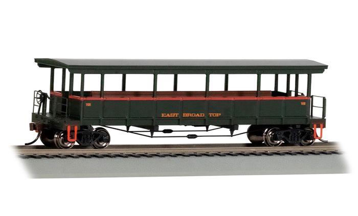 Purpose-built for use on tourist railroads and routes with exceptional scenic beauty, open-sided excursion cars provide a more exhilarating, sensory experience, allowing passengers to feel the wind as the train moves, smell the smoke from the locomotive, and hear the whistle as they traverse the landscape. For railroad operators, these cars are also cost-effective, utilizing existing frames and trucks from freight cars. This model represents one of the open-sided cars used on the historic East Broad Top Railroad in central Pennsylvania. Operating as a tourist railroad since ceasing service as a common carrier in 1956, the East Broad Top is one of the most complete historic railroad operations in the United States and has been described as an irreplaceable national treasure by the Smithsonian Institution.