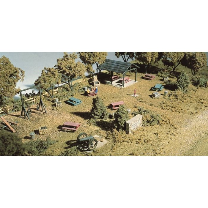 A small community would not be complete without a place to get together on those warm summer evenings. Thirty-eight white metal castings, nine trees, foliage, turf, and the materials for fence and shed are included in this 8" x 14" (20.3 cm x 35.5) scene.