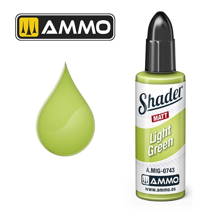 Acrylic based paint Light Green color specially formulated to create shadow effects in specific areas by airbrush. 10mL jar The dead matt finish of these paints makes them perfectly suited to shade the panel lines and recesses of your models. You can also imitate dirt and streaking effects by spraying fine lines with the airbrush. They can also be used to slightly alter the base colour by adding a few drops of Shader in order to simulate more heavily weathered surfaces. They can also be applied with a brush to outline or darken a specific area. The Matt Shaders can be removed with water and provide working time, cures completely within 24 hours. If you want to dilute these colours to achieve a more transparent effect, use the Acrylic Thinner (A.MIG-2000) or Transparator (A.MIG-2016).
