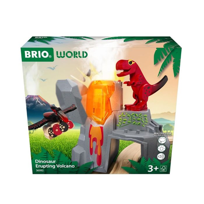 Rumble, boom, crash! The Dinosaur Erupting Volcano is about to blow. Create epic prehistoric adventures by integrating this dinosaur-themed playset and figures into your BRIO World layouts. Wake the volcano by pressing the small button on its peak - activating glowing lava lights, volcano sounds and safe-to-touch steam effects that bloom from the volcano vent. Then watch the volcano explode open as the T-Rex stands proudly at the top, overlooking its kingdom.
