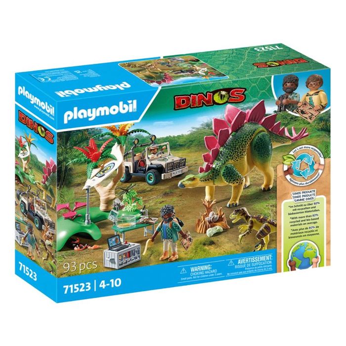 - Detailed dinosaur toy set with two Playmobil figures, a Stegosaurus, a Deinonychus, a snake, an off-road vehicle, dino eggs, a nest, walkie-talkies, and other exciting extras for big dino fun.