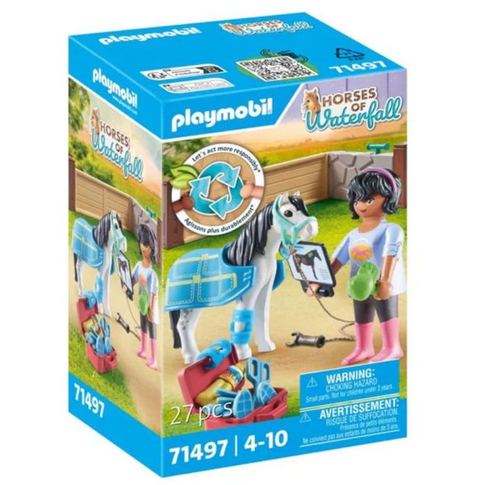 PLAYMOBIL Horse therapist with bandages and extensive accessories for the care and therapy of horses. Take care of the ponies at Waterfall Ranch with the horse therapist from PLAYMOBIL. The animal therapist carefully examines the horse to find out what's wrong and discovers an injured fetlock. After applying a bandage, the therapist soothes the animal with strokes. Soon everything is fine again. A lovingly designed horse play set with a PLAYMOBIL figure, a pony, a horse blanket, bandages, halter and many other accessories for caring for the horses. Also includes a sheet of physiotape to care for the horses.