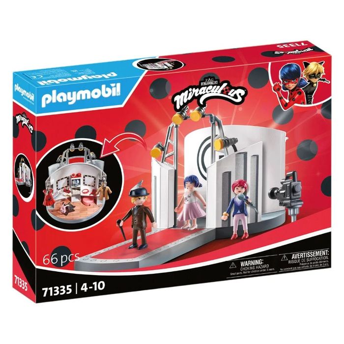 Welcome to the exciting world of Ladybug and Cat Noir with the new PLAYMOBIL playset Miraculous: Gabriel's Fashion Show! The set includes the main character and aspiring fashion designer Marinette Dupain-Cheng, as well as Adrien Agreste, her classmate and model at the fashion show. The runway consists of a round baseplate, a detachable catwalk, and wall elements with two dressing stations. Here, the characters can prepare for their performances and store their make-up tools and accessories on the shelves of the dressing room wall. Marinette can choose between an elegant dress with a matching mask and fans, a trendy skirt, a backpack, as well as various necklaces and bracelets. Adrien comes with a silicone coat, a helmet, a cane, and a stylish hat.