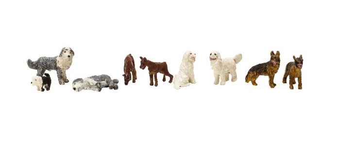 Contains nine different canines of various breeds. They are performing an array of actions including walking, sitting, laying and sniffing the ground.