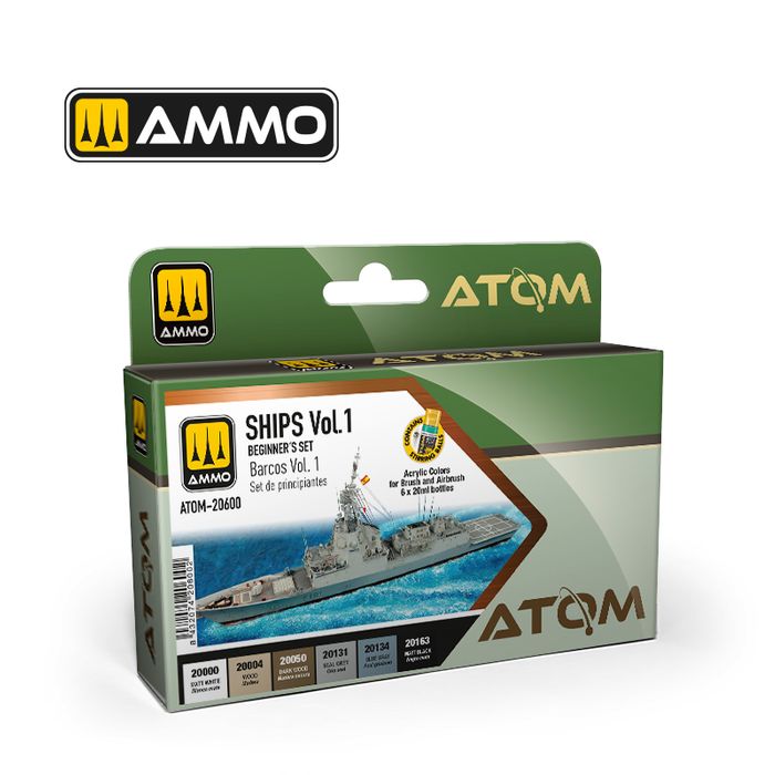 A basic, but indispensable colour set to start painting your ship models. With this set, you will be able to paint a wide variety of models, from wooden ships from Classical antiquity and the Age of Sail, such as caravels, galleys, galleons and ships of the line, to modern frigates, submarines and aircraft carriers, through a huge array of WWI and WWII vessels. Made up of a carefully chosen selection of essential ATOM colours, this set includes: Matt Black, Matt White, Wood, Dark Wood, Seal Grey and Blue Gray. Each colour has been designed to offer comfort and precision, contributing to an impressive and accurate finish.
