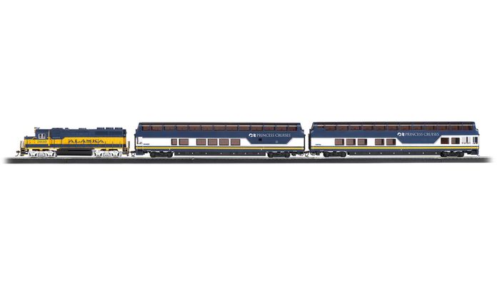 Navigating some of America's most dramatic scenery, the Princess Cruises® Denali Express transports tourists and nature lovers alike over the historic Alaska Railroad. Operating between Anchorage and Fairbanks, the Denali Express gives cruise passengers a chance to see the Alaskan wilderness up close, with opportunities to witness bears, moose, Dall sheep, and bald eagles in their natural habitat of Denali National Park from the comfort of specially designed Vista-Dome railcars. Updated to reflect the latest paint scheme worn by both the Alaska Railroad locomotives and Denali Express cars, this set arrives with an EMD GP40 locomotive, two Ultra-Dome passenger cars, and a complete oval of Bachmann E-Z Track®. Climb aboard to begin your Alaskan adventure with Princess Cruises® and Bachmann Trains!