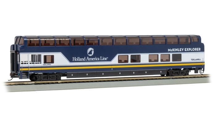 The longest and tallest passenger railcars in North America return to the Bachmann line, displaying the new unified paint scheme worn by cars on the McKinley Explorer and Denali Express luxury cruise trains. Operating over the famous Alaska Railroad, these cars give visitors the best view possible as the train navigates Denali National Park and the surrounding wilderness. With lighted, fully furnished interiors, these cars make a great addition to the recently announced McKinley Explorer and Denali Express train sets, featuring different car names and road numbers from those included in the sets.