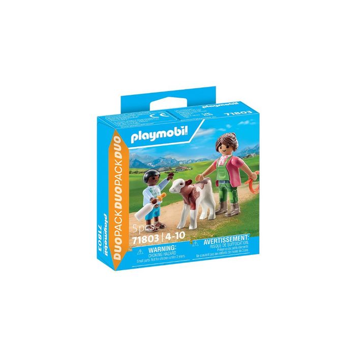 PLAYMOBIL DuoPack with female farmer with child and calf. The child feeds the calf with a milk bottle. The farmer makes sure that the boy does everything right.
